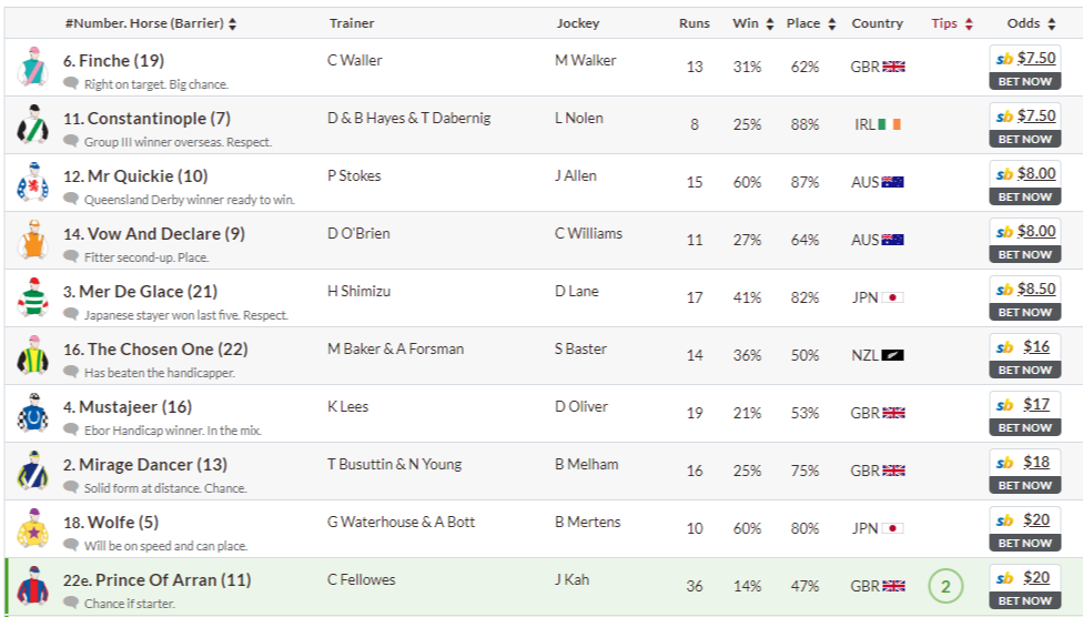 Caulfield Cup 2019 19일 토요일 호주 멜버른 외곽의 콜필드 경마장에서는 멜버른컵 전초전 콜필드컵(Caulfield Cup, G1,2400m)이 개최된다. 한국시간으로 15시 15분에 발주한다. 일본중앙경마회(JRA) 메르 드 글라스 (Mer de Glace)가 출전하며 현재 인기 5위다. 보결마 출전 가능성이 있어 경주 당일 아침에 출전마가 확정되며 현재 21두가 출전 예정이다. 영국의 Finche와 아일랜드의 Constantinople가