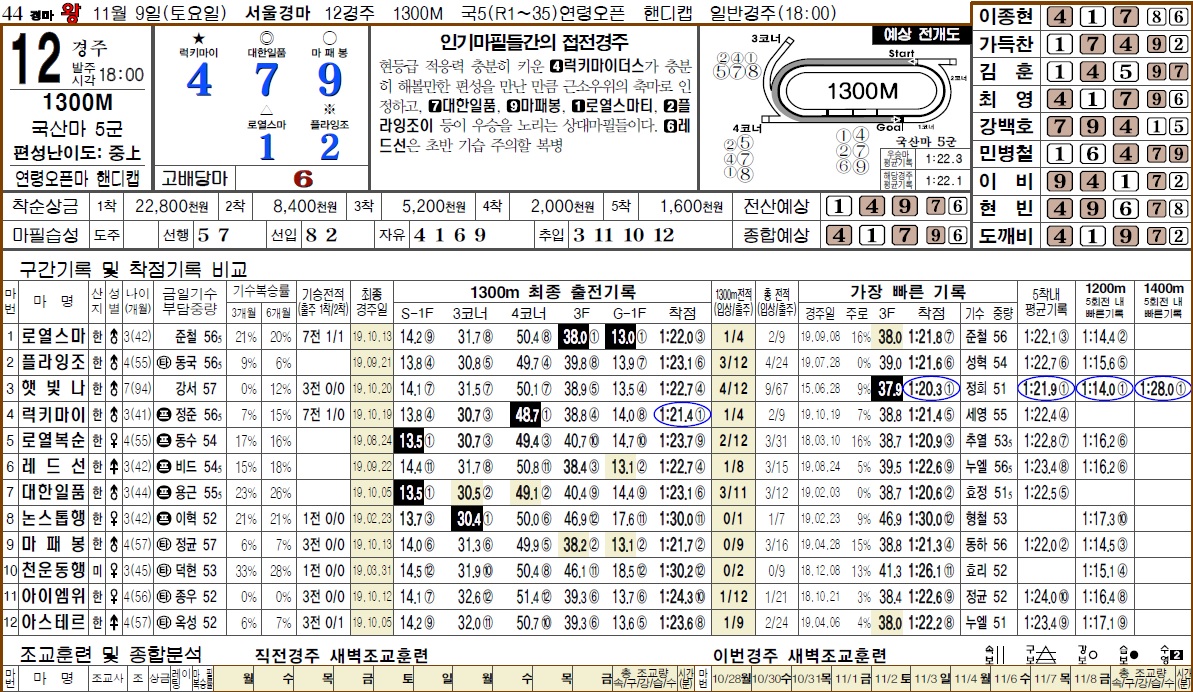 경마왕 스피드 경마예상지 2019년 11월 9일 한국마사회 과천 서울경마장 토요경마 제12경주 한방 역전 삼쌍승식 고배당 경마예상
