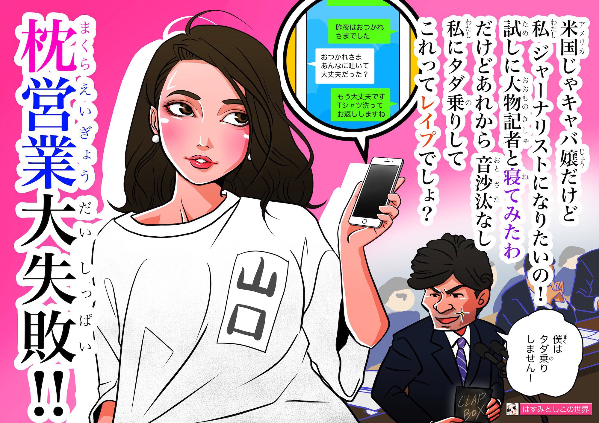 상대는 마쿠라영업 대실패(枕営業大失敗) 4컷의 일러스트를 제작하여 우익 성향의 잡지 월간 Hanada에 공개한 풍자 만화가 하스미 토시코다.