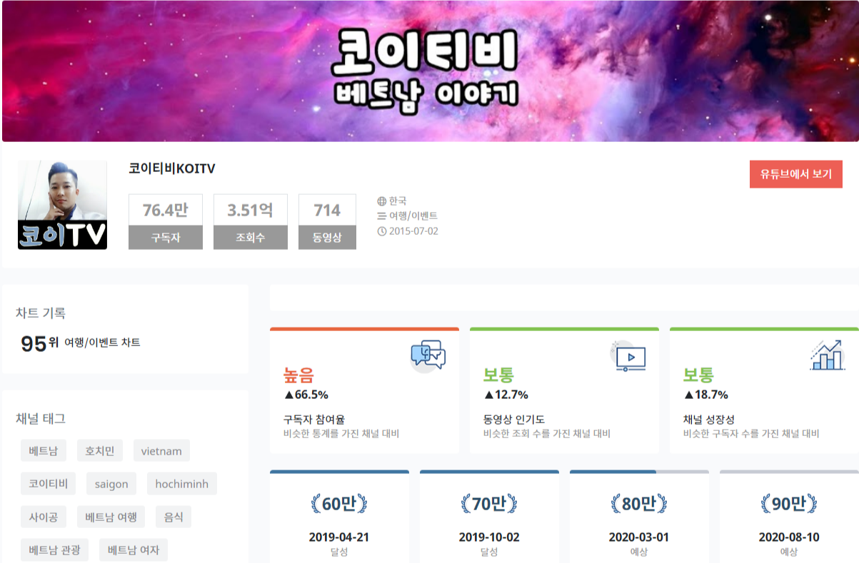 2020년 1월 2일 기준 유튜브 한국 여행/이벤트 차트 순위 95위에 올라있다.