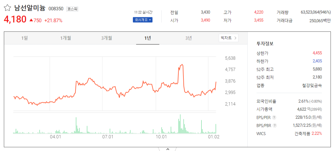 15일 오전 11시30분 현재 남선알미늄은 전일 대비 750원(21.87%) 오른 4,180원에 거래되고 있다.