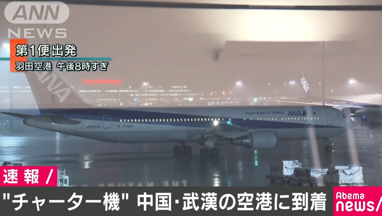 저녁 8시반경 도쿄 하네다 공항을 이륙한 전일본공수 ANA항공 차터기는 0시29분 우한공항에 도착했다.