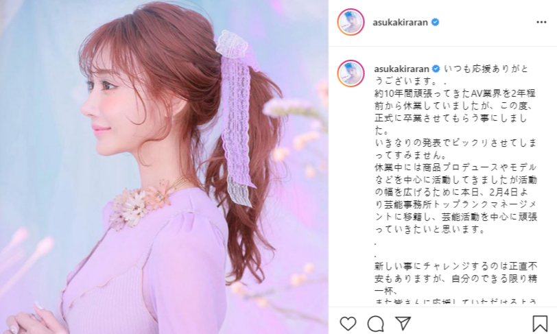 일본 야동계의 스타 인기 여배우 아스카 키라라(明日花キララ)가 2월 4일 자신의 인스타그램을 통해 약 10년간의 AV배우 생활을 마감한다고 발표했다.