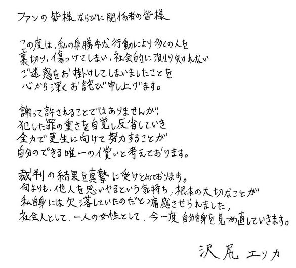 마약 단속법 위반 여배우 사와지리 에리카, 판결 후 자필 사과문 발표 | 김타쿠닷컴