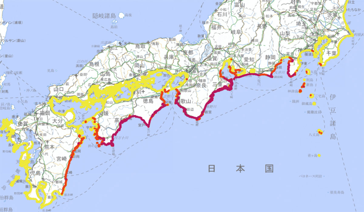 일본 난카이(南海) 트로프 연안 지역에서 향후 30년 이내에 쓰나미가 발생할 확률을 지역별로 세분화한 지도가 21일 일반에게 공개되었다.방재과학기술연구소(방재과연)가 만든 J-THIS 쓰나미(津波) 해저드 스테이션 웹사이트는 지난 1월 일본정부 지진조사위원회에서 처음 공표했다.쓰나미 높이는 10m 이상, 5m 이상, 3m 이상 세가지로 구분했으며 쓰나미가 덮칠 확률이 높은 순으로 보라색, 적색, 황색으로