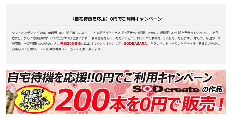 신종 코로나 바이러스(코로나19) 확산으로 방콕 오타쿠 생활을 하고 있는 팬들을 위해 일본 야동 제작사 소프트 온 디맨드(SOD)는 200편의 AV를 13일부터 3월말까지 무료 방출한다.이름하여 자택 대기 응원! 0엔 캠페인(自宅待機を応援!!0円でご利用キャンペーン)영상을 시청하기 위해서는 회원 등록이 필요하다.또한 이번 0엔 상품을 이용한 회원 중 선착순 200명에게는 SOD 오리지널 오나컵(자위용