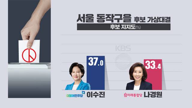 중앙일보가 입소스에 의뢰해 13, 14일 이 지역 유권자 501명에게 물어본 결과 ‘누구에게 투표하겠느냐’는 질문에 나경원 후보를 찍겠다는 답변이 36.6%, 이수진 후보에게 투표하겠다는 응답은 36.2%였다. 오차범위(±4.4%포인트) 이내의 호각세다.