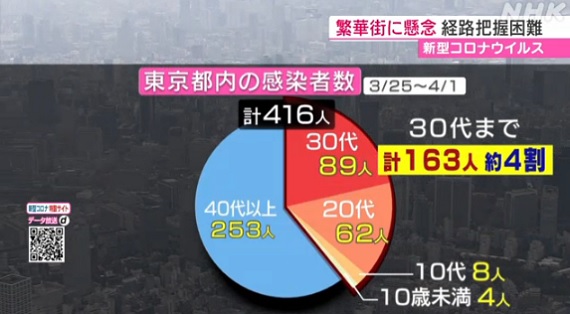 감염자가 급증한 도쿄올림픽 연기 발표 다음 날인 3월 25일부터 이달 1일까지 도쿄도 코로나19 확진자 416명을 분석한 결과 약 40%인 163명이 만 40세 미만이었다.