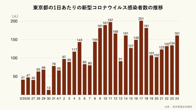도쿄도 감염자 161명중에서 26명은 집단감염이 발생한 내리마구 네리마히카리가오카(練馬光が丘) 병원 관계자다.