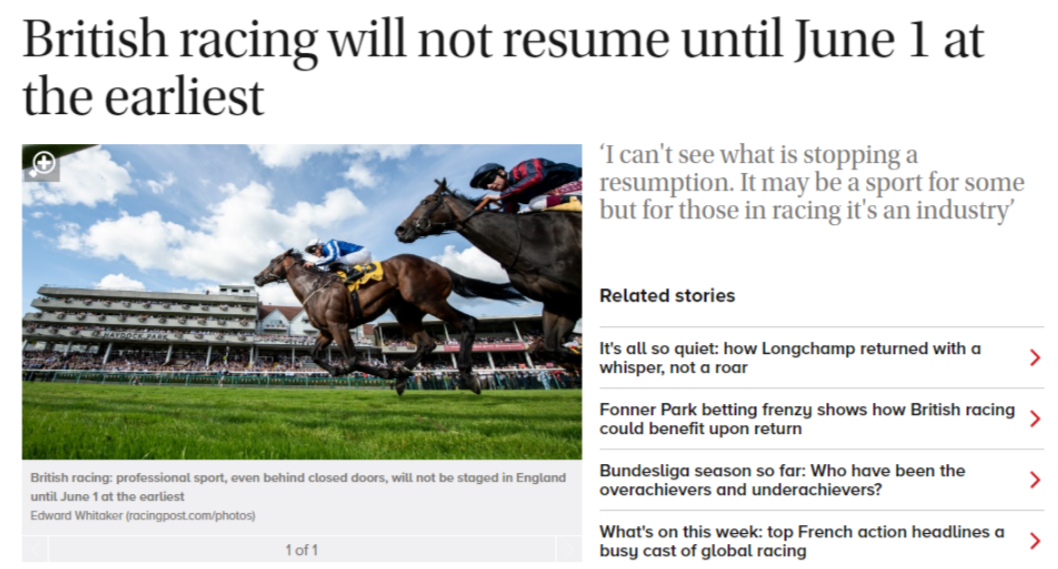 코로나19 팬데믹 영국경마 재개는 빨라도 6월