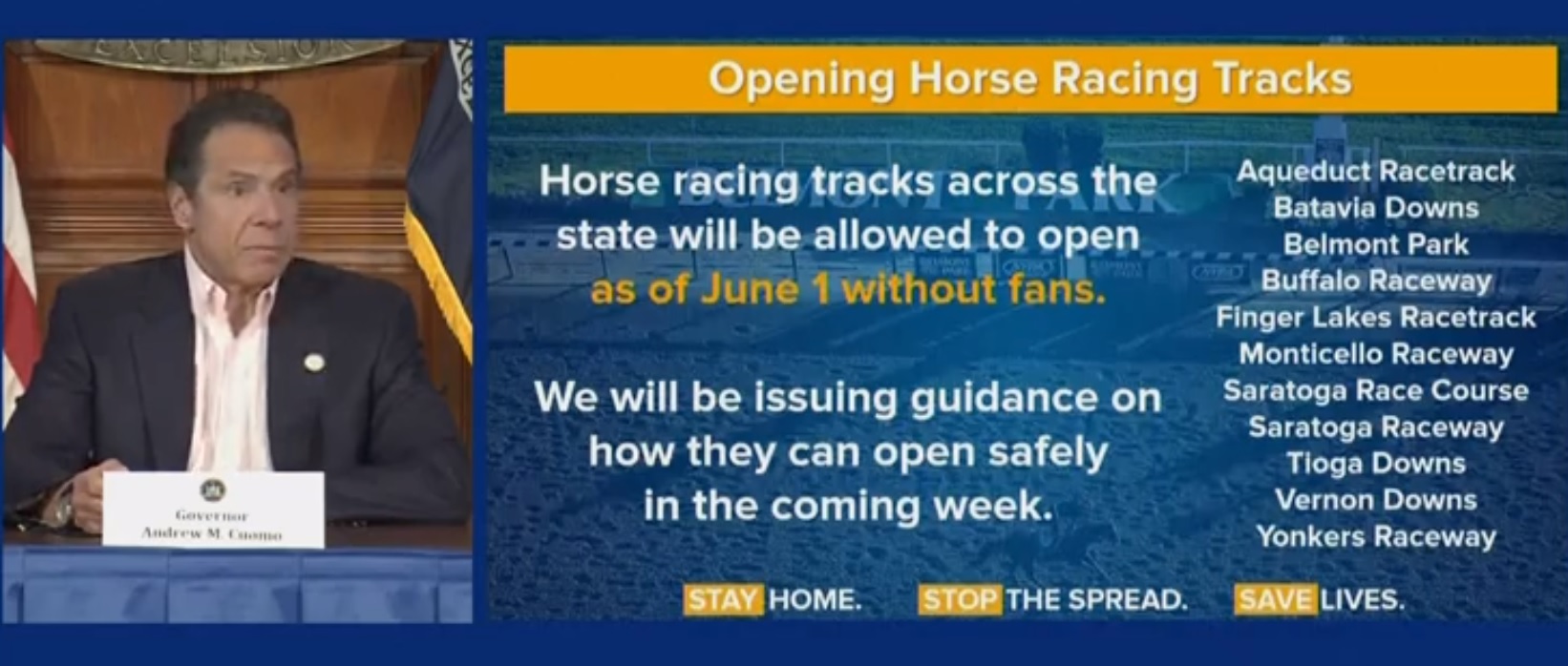 5월 17일 앤드루 쿠오모 뉴욕 주지사는 6월 1일부터 뉴욕주 11개 경마장 무관중 경마를 재개한다고 발표했다.