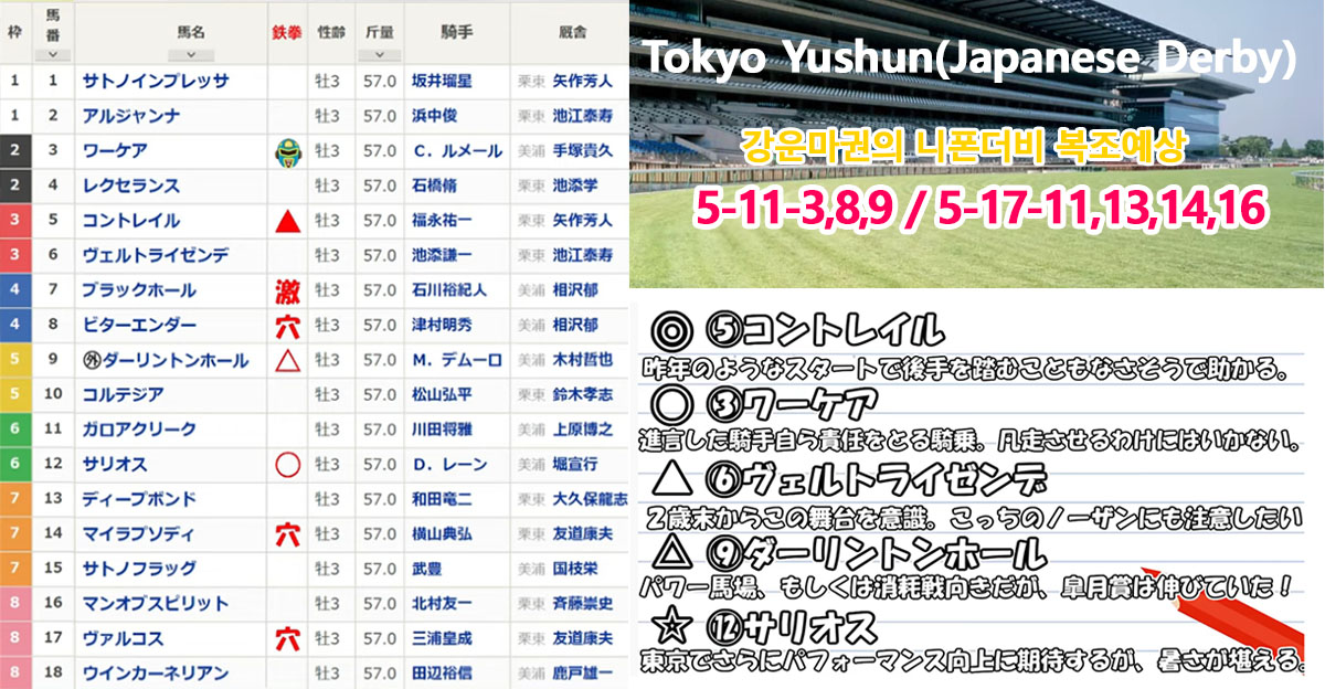 “금주 JRA 중앙경마 교토, 도쿄 개최! 전경주 및 경마여신의 일본더비(Japanese Derby) 예상, 경마사이트 스포츠신문 종합예상지 공유! #일본경마 #일본경마예상 #일본경마배팅 #경마왕 #경마여신”