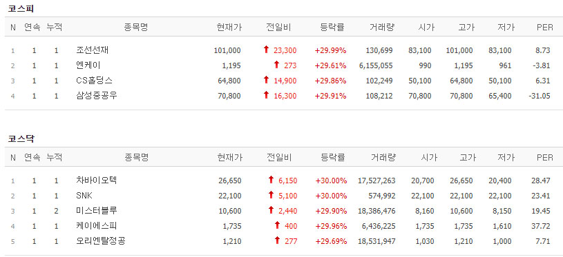 | 주식투자 5월29일(금) 코스피, 코스닥 장마감 후 주가 상승, 상한가 종목 30 (0) | 2020.05.30 |