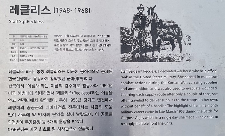 경기도 연천 고랑포구 역사공원 앞에도 군마 레클리스 하사의 동상이 있다.