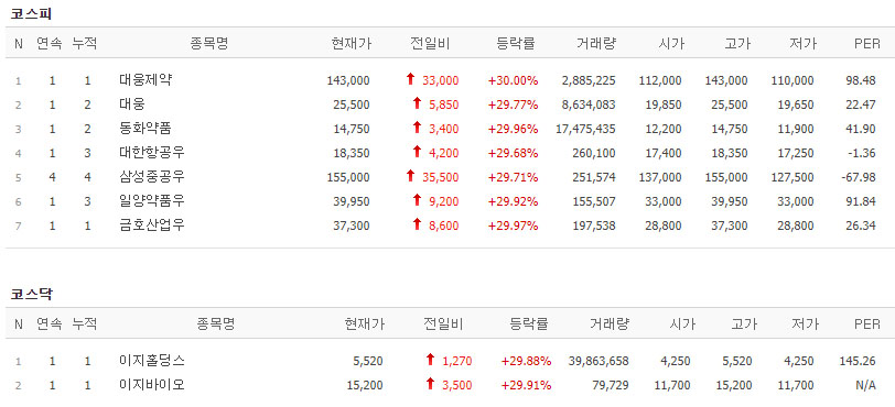 | 28 | KPX생명과학 | 6,850 | 550 | +8.73% | 1,292,530 | 6,840 | 6,850 | 9,376 | 32,272 | 761.11 | 2.00 |