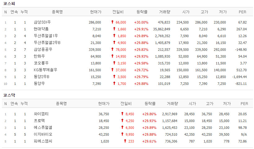| 3 | 힘스 | 31,450 | 5,600 | +21.66% | 3,579,790 | 31,450 | 31,500 | 13,452 | 9,162 | 23.93 | 14.90 |