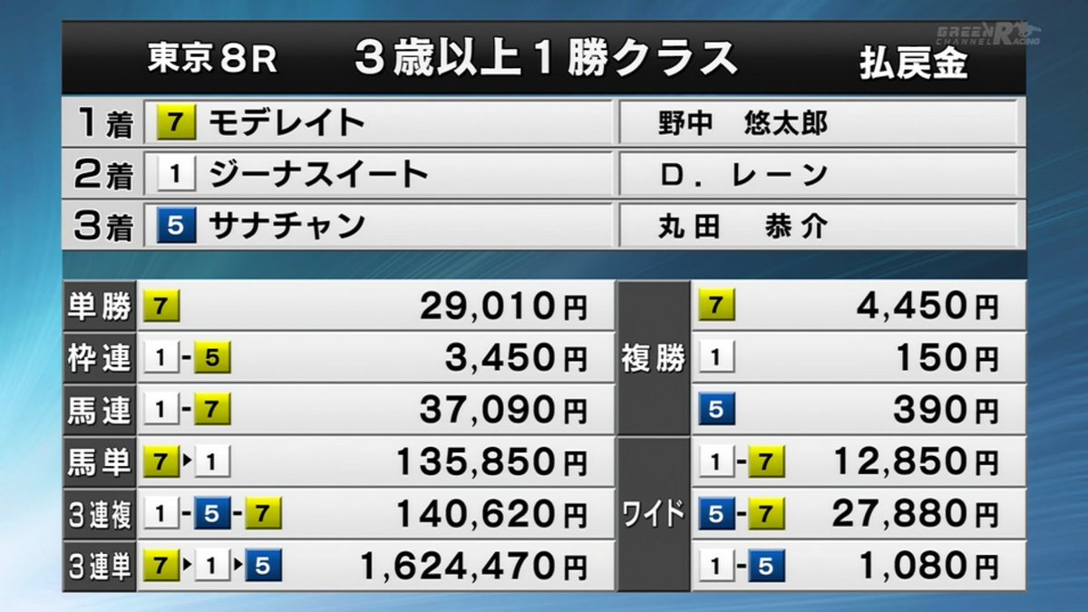 제8경주에서는 출전마 14두중 인기 꼴찌마가 1착을 하며 단승식 290.1배, 삼복승식 1400배, 삼쌍승식(7-1-5) 16244.7배(1,624,470엔)의 고배당이 나왔다.